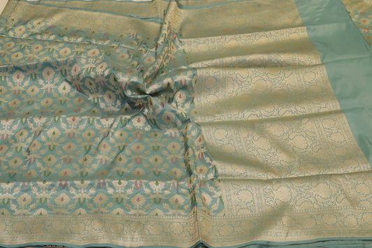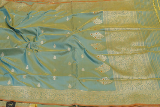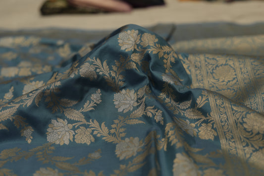 Pure Handloom Katan Jungla Cutwork turquoise blue Saree 13