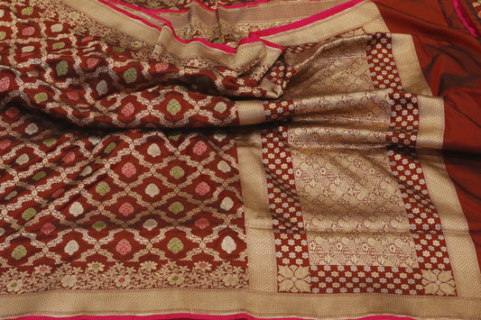Pure Handloom Katan Jungla Cutwork Maroon Saree 9