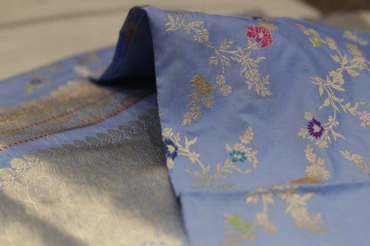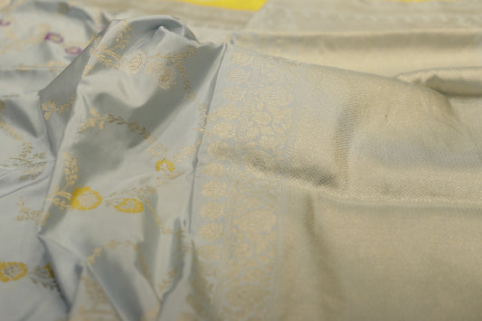 pure handloom katan premium ektara jungala tilfi weaves light blue & golden work saree