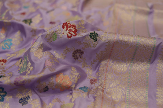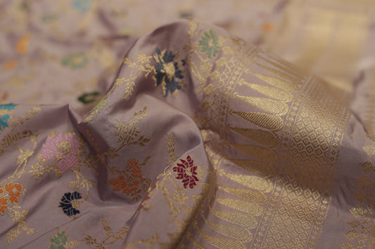 pure handloom katan premium ektara jungala tilfi weaves soft lavender pink , golden zari work & multi-color floral motifs saree